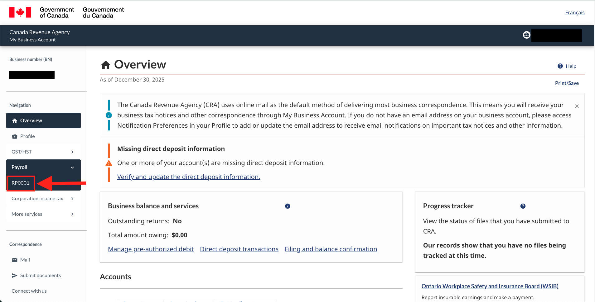 It follows the format: 123456789RP0001, where the 9-digit Business Number is used for all CRA programs, and RP identifies it as a payroll account.
